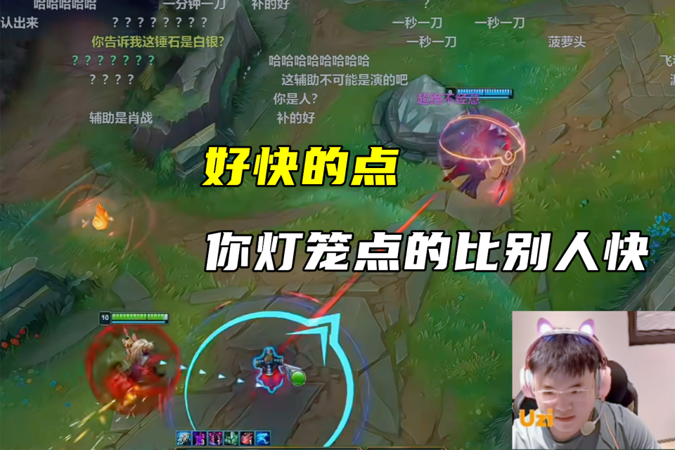 在后续的对位中,Uzi一直指挥辅助锤石追着对面打,从表现来看,明明是Uzi带着锤石在玩,可他嘴里却一直在把锤石当小孩夸,表示是锤石玩得好,自己跟着喝汤。打野石头人听麻了,也是赶忙制止:行了,你们下路不要再商业互吹了。下路对线结束之后,Uzi也是带着锤石开始了游走推线,锤石不知道是不是猜到了Uzi的身份,在看到Uzi快速点灯笼后直呼:好快的点,你比别人点灯笼都要快。而乌兹也是开始整活,问锤石:我的VN这么强没人夸吗?你们见过谁的VN比我的厉害?
