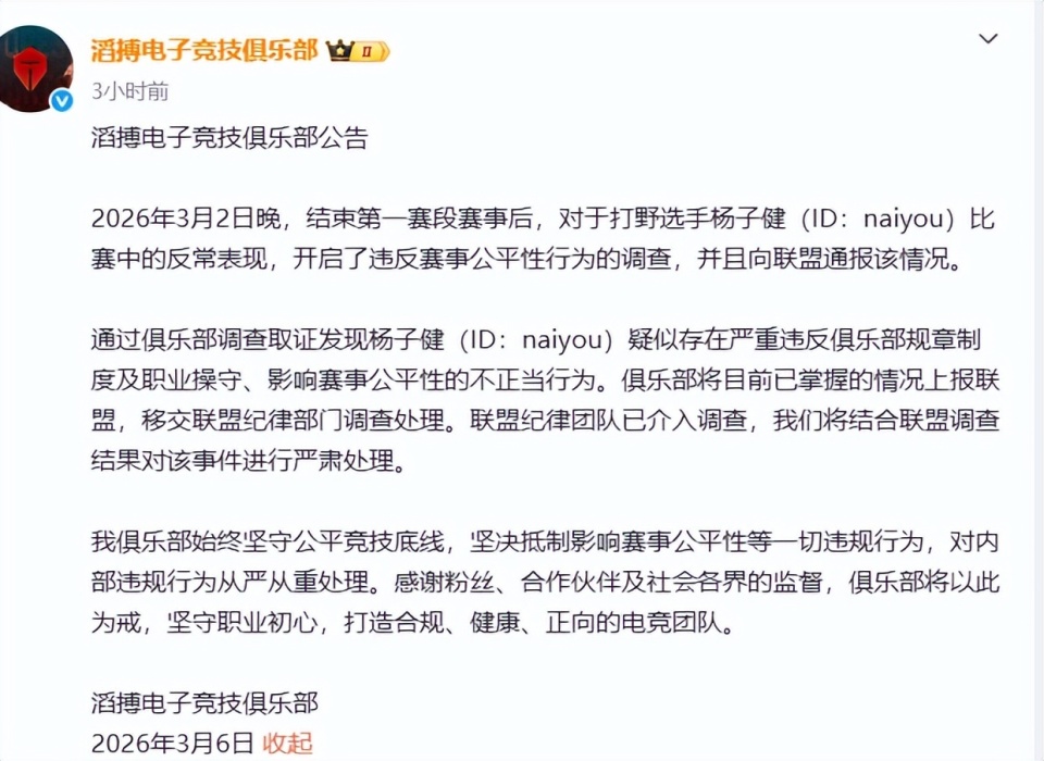 本来一切都结束了,谁曾想,这个双绿甲蝎子,真的有问题,没错,奶油打假赛,性质太恶劣了,TES官方都已经上报联盟调查了,这下实锤了,严重违反俱乐部规章制度和职业操守,影响比赛公平。