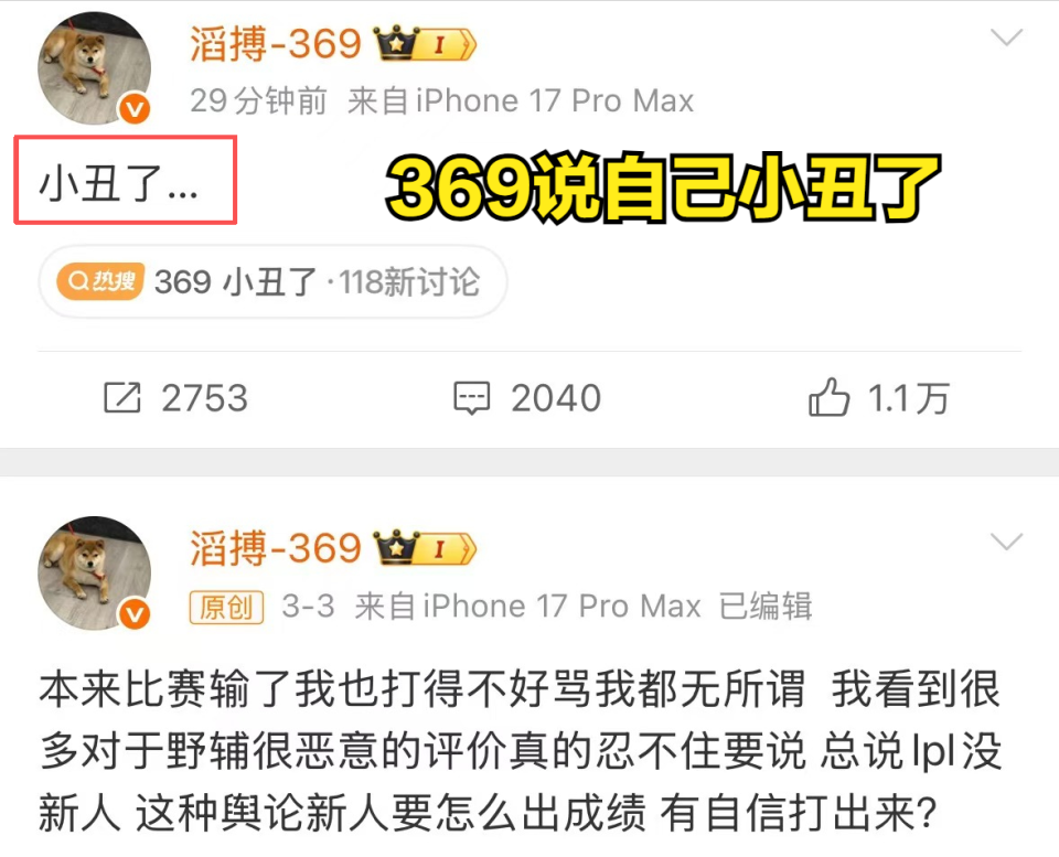 而TES战队这个帖子发布后,还对一位选手影响比较大,那就是上单369,因为上次比赛后,369主动站出来替新人发声,直言:“总说LPL没有新人,这种舆论新人要怎么出成绩,有自信打出来?”而在TES战队发帖后,369也在第一时间发了帖子:“小丑了……”不少网友也是评论道:“这就是你维护的已经打了三年的LPL宝贝新人打野。”;还有网友说道:“都说了,观众的眼睛是雪亮的。”