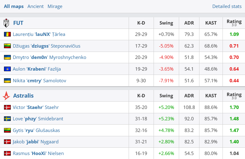 本场Astralis状态火热,在两张地图都是碾压局,图一Ancient上jabbi仅2HP完成1V3残局!图二Mirage上A队更是在防守方豪取11分,轻取对手完成复仇。