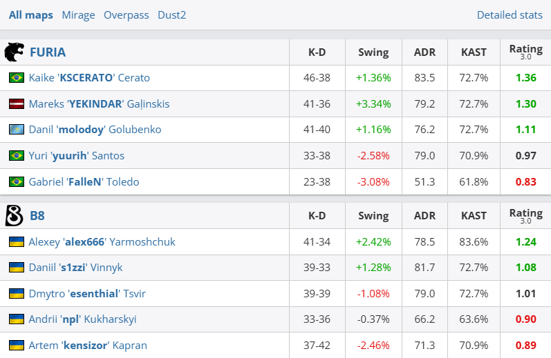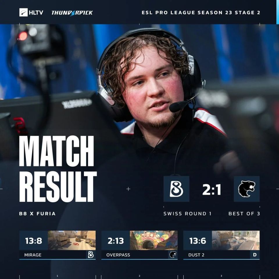 图一Mirage,alex666单局4杀打赢2V4令队伍士气大振,B8半场进攻拿到7分。换边教父赢下手枪局一度将比分追至8平,但关键局黑豹守包架点交流出现问题,B8连下5局赢得图一。图二Overpass完全是黑豹的单方面吊打,轻松扳回一城。来到决胜图Dust2,B8上来便高歌猛进取得8-4的巨大防守优势,换边后黑豹也没有什么起色,全队仅黑闪1人正战绩,B8最终三图爆冷FURIA。