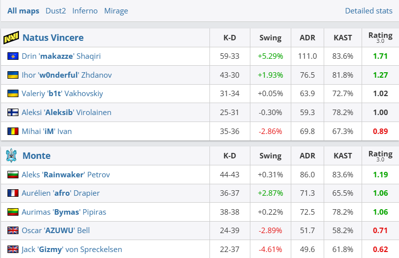 图一Dust2,Monte进攻方打得NAVI如路易十六挠头——摸不着头脑,轻松先下一城。图二Inferno上NAVI也在进攻端杀穿对手豪取11分,回敬Monte一图。决胜图Mirage双方战至白热化,从5平、6平战至10平。关键局b1t用AK和格洛克打赢1V3残局,将对手打入经济局,最终NAVI以两分优势惊险取胜。