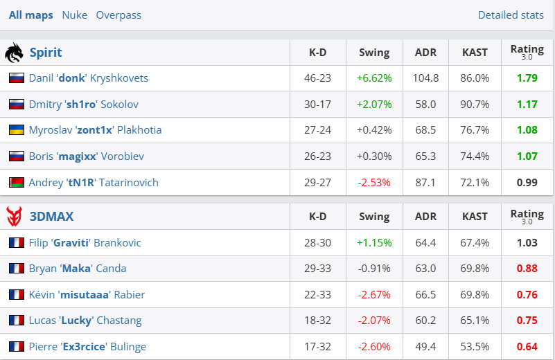 图一Nuke,0-2开局下donk一把沙鹰双杀、单局4杀翻盘。再加上tN1R手感越来越热,绿龙将优势扩大至11-6。尽管法国队一度追至10-11,但关键局donk破B双杀打赢3V5取得赛点,绿龙有惊无险先下一城。图二Overpass,丢掉手枪局后又是donk沙鹰解决A区翻盘,凭借其半场16杀的逆天表现,绿龙进攻豪取8分。换边法国人也仅仅追了3分便缴械,Spirit迎来开门红。