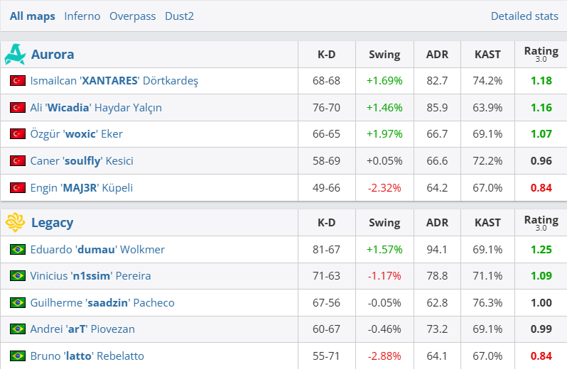 图一Inferno,礼神一枝独秀的表现领衔土耳其队半场守住9分。不过下半场saadzin、dumau接连爆发也回敬一波9-3铁血防守进入加时。结果双方鏖战4个加时,Aurora才拿下图一。图二Overpass两队从3平、7平到8平,下半场在dumau、艺术哥和n1ssim轮番输出下,巴西队一波5-1攻势扳回一城。决胜图Dust2在n1ssim、dumau和saadzin三人合力输出先拿赛点后,Aurora顽强追进加时。加时赛土耳其队以强势防守终结了这场黏性十足的比赛。