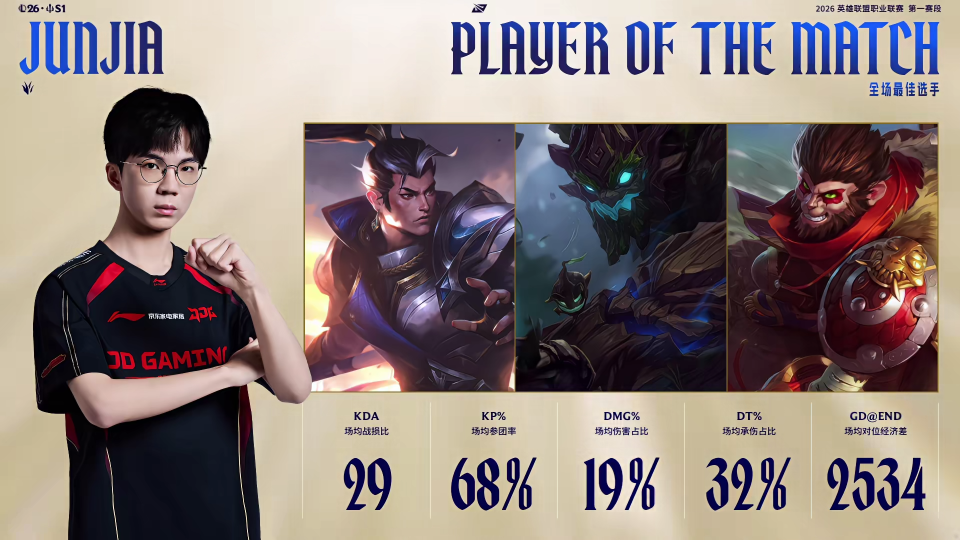 今天LPL的败者组决赛,JDG出人意料以3:0血洗WBG,进入决赛,并拿到全球先锋赛门票。Junjia赵信发挥完美,连拿4条小龙收龙魂+远古龙+大龙,JDG势不可挡,先下一城。HongQ永恩发育超前,如鬼魅一般,三刀秒一人。JDG再下一城拿到赛点,游戏结束时,HongQ对位领先6k经济。最后一波团战,WBG追人过急,Zika狼母空大。JDG果断反打,Vampire萨勒芬妮大中3人,JDG团战大胜后一波,赢下比赛!在赛前,更多人会看好WBG,因为小组赛WBG双杀了JDG,打野位置Jiejie不仅状态火热,更是稳定“逮捕”Junjia。但是最终结果却是JDG 3:0的大胜,Junjia对位Jiejie获得全场最佳选手。在赛后采访中,Junjia和Vampire透露在假期依然努力打排位。Junjia:“我们过年前输完滔搏,过年也没有过得很开心,一直打排位,现在进决赛就觉得,努力还是有点用。”Vampire:“我们年前结果不是很顺利,放假时还是在家里积极打排位,希望年后回来打得更好。”这就是电子竞技的魅力,没有永远战胜不了的对手,只要付出努力,就会有收获。AL仅在四强阶段就被淘汰,而Tabe却带领JDG进入决赛,再一次证明了他的执教能力。Tabe也是第一位带领4支不同队伍(RNG、BLG、AL、JDG)进入LPL决赛和国际赛事的教练。并且JDG的选手阵容不能算特别豪华,Junjia曾经只是Jiejie的替补,Vampire在EDG时被嘲讽为“四小天才”。Tabe是真能带选手进步,而不是每个位置买最贵选手,自己只需点外卖的教练。LPL参加全球先锋赛的两支队伍已经确定了,BLG和JDG。23年BLG和JDG一起参加MSI,是第一次,也是目前唯一一次,两支LPL队伍会师拳头国际大赛决赛。希望这一次,两队也能有好运。在全球先锋赛之前,明天还要打第一赛段决赛,决出优胜者和全球先锋赛的种子顺位。第一名首轮一定打BFX,第二名首轮一定打GEN。(双败赛制,输了也不会被淘汰。)之前胜者组决赛的交手,BLG 3:2 战胜JDG,但因为5局都是BLG大优势,被调侃为“实则5:0”。明天打完,比分会变成多少呢?