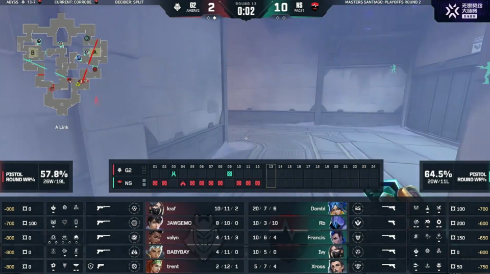 第9回合NS主动出击,放空A包点,在B点前压控图推进,G2被拆分逐个打掉。