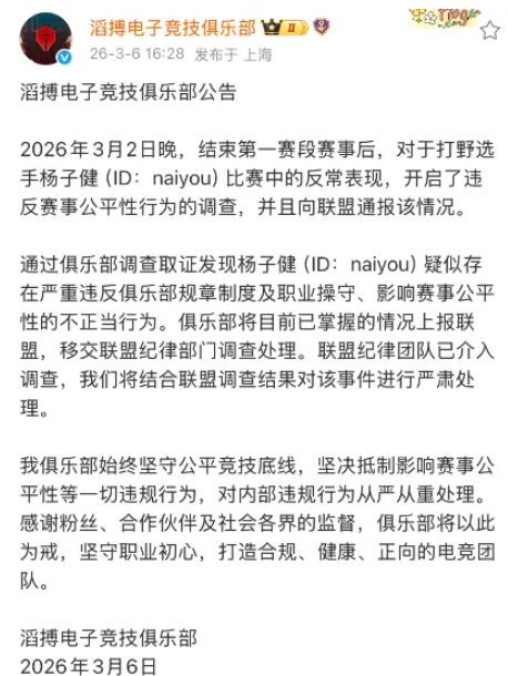TES经理假装要开会,naiyou一进门就强行扣留手机,拿到假赛证据,近日,电竞圈再次因为“假赛风波”掀起讨论,LPL战队TES发布公告称,在内部调查取证过程中,发现打野选手Naiyou疑似存在不正当行为,目前俱乐部已启动进一步调查流程,虽然官方措辞相对谨慎,但消息一出仍迅速在玩家群体中引发热议。