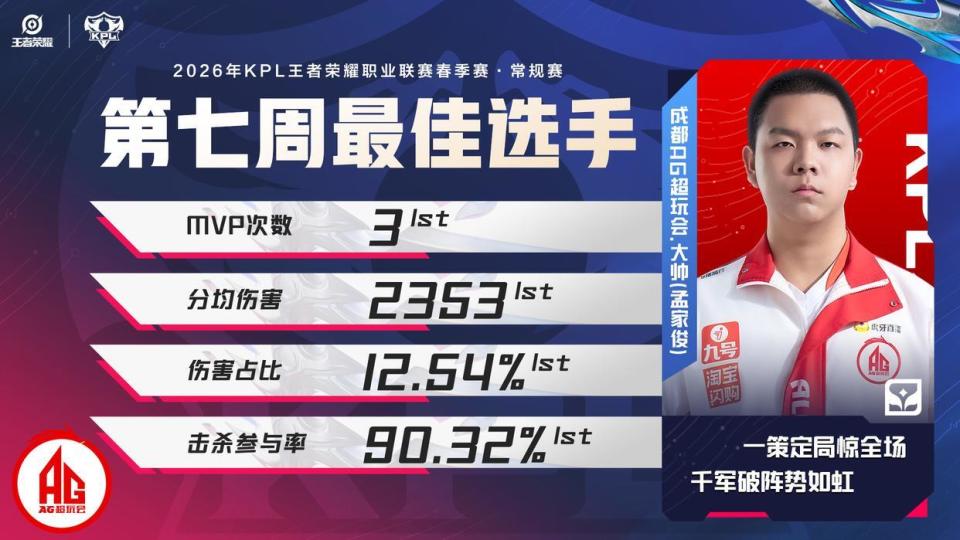 KPL第七周最佳榜单:“FMVP清融稳定C,AG大帅击杀参与率90%!”