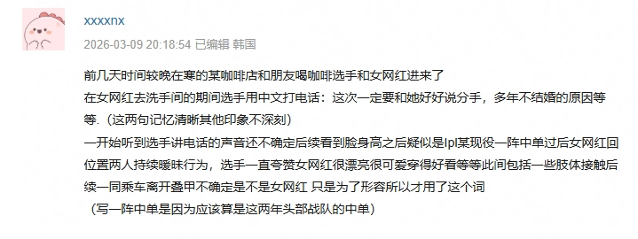 而在官宣分手的消息传开后,之前的一则爆料更是让事件再度升温。有网友发帖称,近期在韩国偶遇过一位LPL中单选手,该选手与当地某女网红举止暧昧,还曾用中文打电话,通话内容提及“要好好说分手”以及“多年不结婚的原因”。结合Rookie的韩国国籍、主动提分手的细节,以及近期的行程,不少网友纷纷猜测,这位选手大概率就是Rookie。