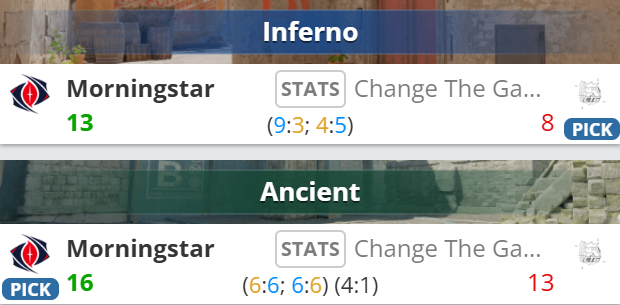 图一Inferno上半场在rage和expSasiKi联手发力下,Morningstar以钢铁防守豪取9分。换边尽管CTG一度追至7-9,但长枪局起Morningstar一波4-1攻势稳稳赢下图一。
