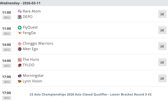 今天11:00将继续第3日争夺,共6场Bo3。其中涉及中国队的比赛中,RA vs DEPO、FengDa vs FlyQuest、Morningstar vs LVG的比赛均为生死战,TYLOO vs The Huns则为胜者组半决赛。赛程如图,欢迎届时收看。