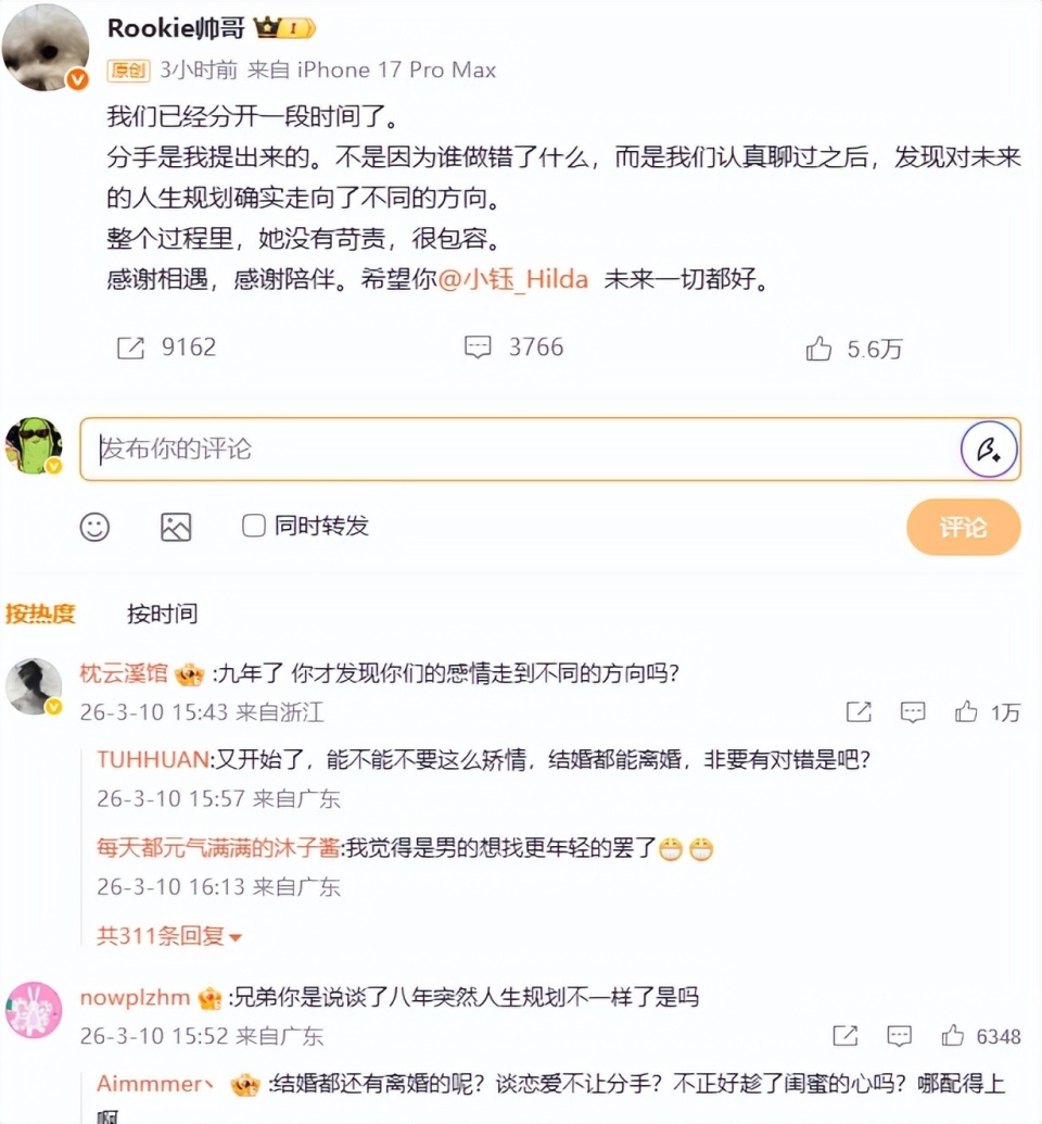 可以看到,Rookie直接发文了,我们已经分开一段时间了,分手是我提出来的,不是谁做错了什么,而是认真聊过之后,发现对未来的规划方向不同。感谢相遇和陪伴,希望小钰未来一切都好。看到这个官宣,有网友们尊重选择的,也有表示十分不理解。比如,为什么相处9年了,才发现未来的规划不同呢?这个理由有点太牵强了吧,不爱就不爱了,不要说别的理由。