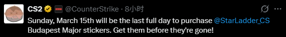 Valve宣布,玩家仅剩5天时间购买StarLadder布达佩斯Major的纪念贴纸。开发人员将于本周结束前(3月15日)将其从商店中移除。