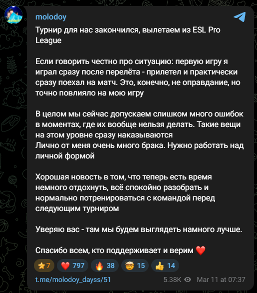 好消息是,现在有点时间可以稍作休息,冷静地复盘,在下个赛事前和队伍好好训练。我向你们保证,到时候我们会打得更好。感谢所有支持我们、相信我们的人。”