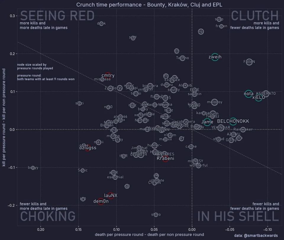 今日数据分析师btrams对比了选手们在比分达到9-9或更高(关键时刻)时的表现变化。让我们一起看关键时刻谁最可靠?谁又拉掉了?