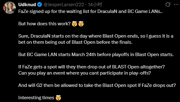 如果FaZe退出了,G2是不是就能接替他们参加BLAST鹿特丹公开赛?太有意思了。”