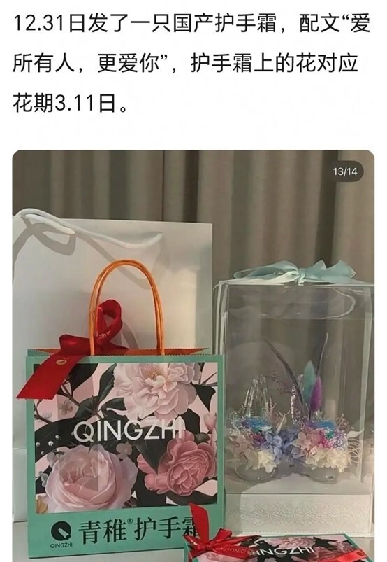 线索三,女网红晒过两次3.11的护手霜,国内品牌,在上海可以买到,早在12月31日的时候就发布了一个动态:爱所有人,更爱你,护手霜的花对应花期为Rookie的生日,也就还是今天。