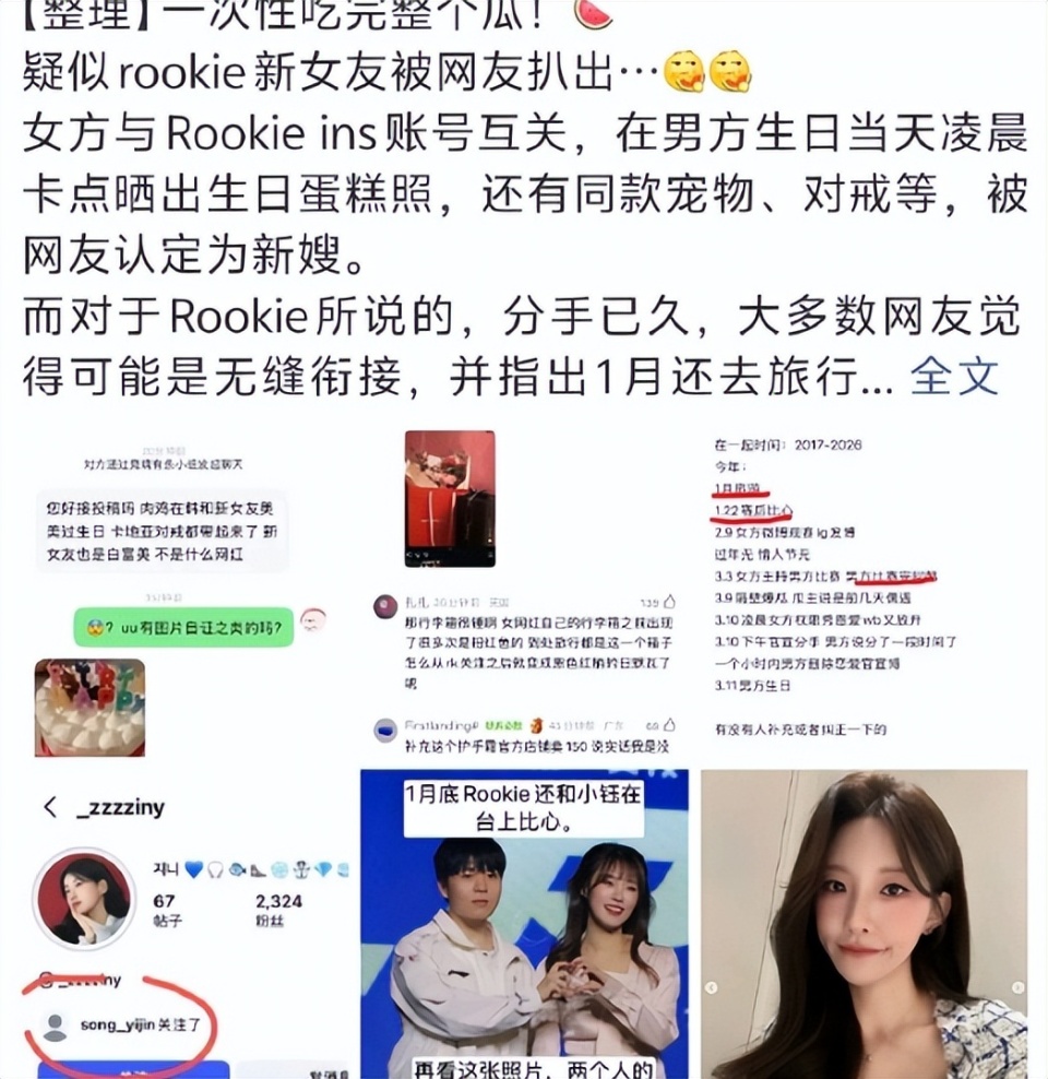 只能说,当代网友们个个都是侦探,太会发现蛛丝马迹,从行李箱到礼物,甚至到女网红发生日蛋糕照片,太秀了。Rookie才官宣分手没有几天,网友们连Rookie新女友都挖出来了,也不知道是不是真的。反正可以看到,也是一个美女,标准的韩国美女,也确实不输小钰,Rookie有点东西啊。
