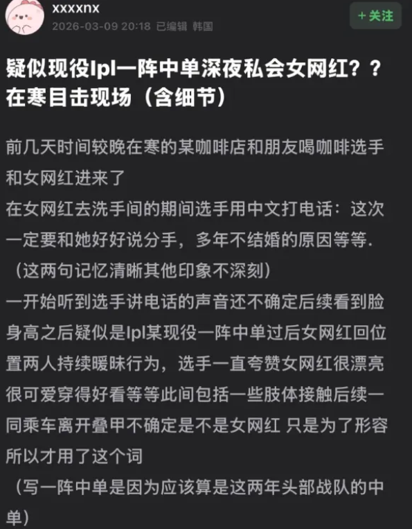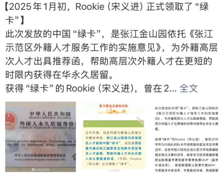 除了绯闻猜测外,还有网友把关注点放在另一件事情上,Rookie在2025年年初刚刚拿到韩国绿卡,从而免除了兵役问题,在LPL选手中,能获得这一资格的人非常少,除了他之外,另一位知名选手就是Doinb,因此,有部分网友开始阴谋论式地猜测,认为Rookie是否在拿到绿卡后才选择结束这段多年恋情。