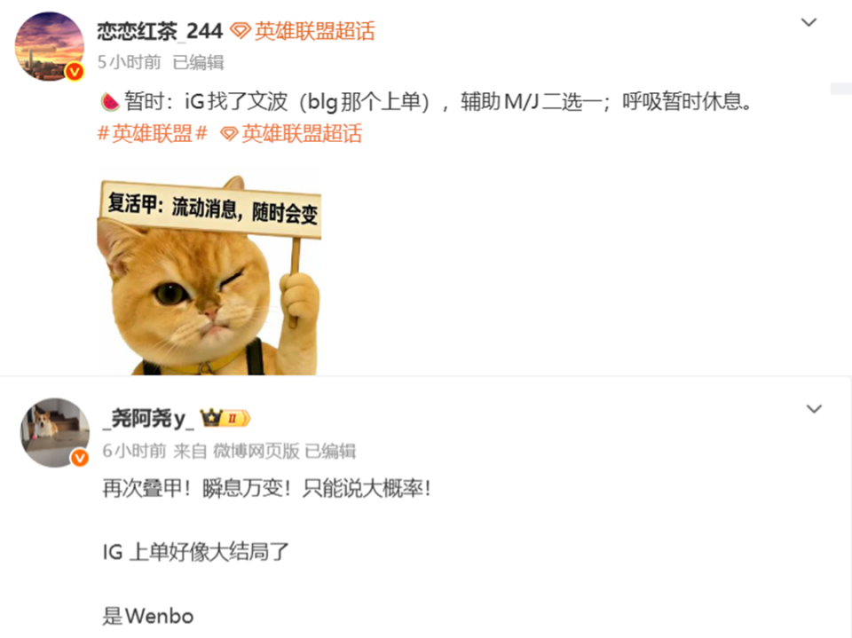 原因则是wenbo在LDL的表现并不好,甚至有1坑4的表现,与他相比,Soboro可能还更靠得住一些。只能说IG既然敢签,那肯定试训效果还行,只能看具体发挥了。另外,辅助一职IG可能也会有变动,在Meiko休赛之时,IG引入了Jwei,有一说一,他的表现还不错。但在Meiko的直播中,他早就透露了自己即将回归,IG究竟是选择表现不错的新人Jwei,还是操作下滑、经验犹在的Meiko,就只能看最后的官宣了。但说实话,Meiko回IG不如去滔搏(狗头)。