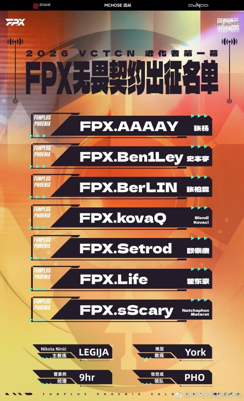 虎扑03月14日讯 FPX无畏契约官方发布2026VCT CN进化者第一幕出征名单。