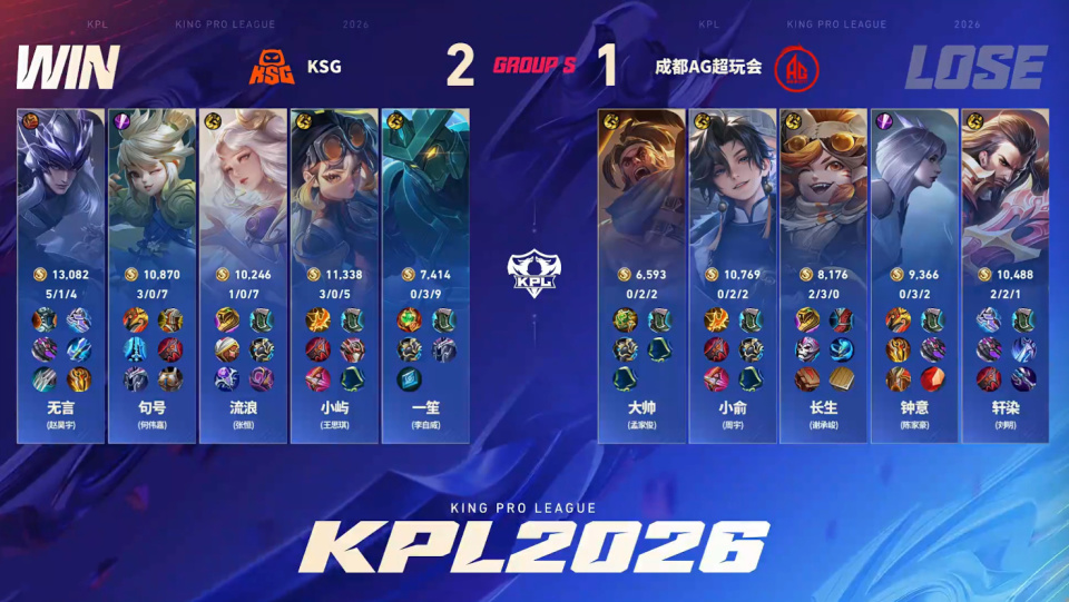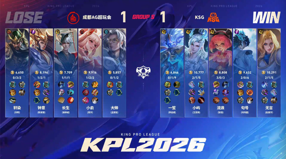 最后一波夏洛特追着关羽跑,正面4打4的团战大帅的鲁班大师先被安琪拉击杀了,关羽绕后又是二技能踩进来,钟馗一钩子钩回关羽,大司命抬手拿下人头。长生的嬴政身陷敌群也走不掉,AG一个一个倒下,KSG扳平比分。