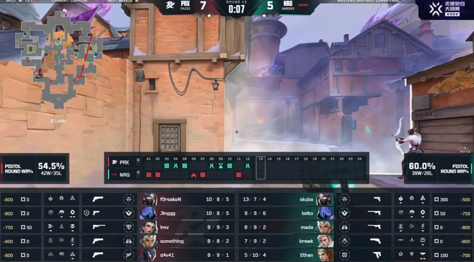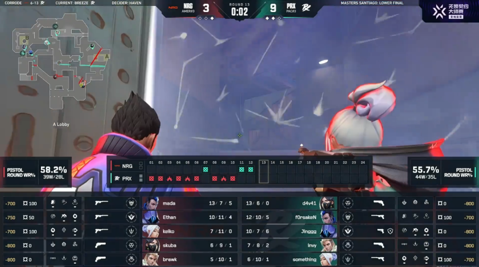 进入下半场NRG拿下手枪局,遭遇到PRX的强势翻盘,PRX打出一波四连胜。