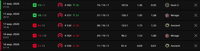 m0NESY在该平台进行了五场比赛,赢下其中两局。而队内其他成员自3月9日起便再未登录过FACEIT。NiKo更是自2026年2月中旬起就完全未在FACEIT上进行过训练。