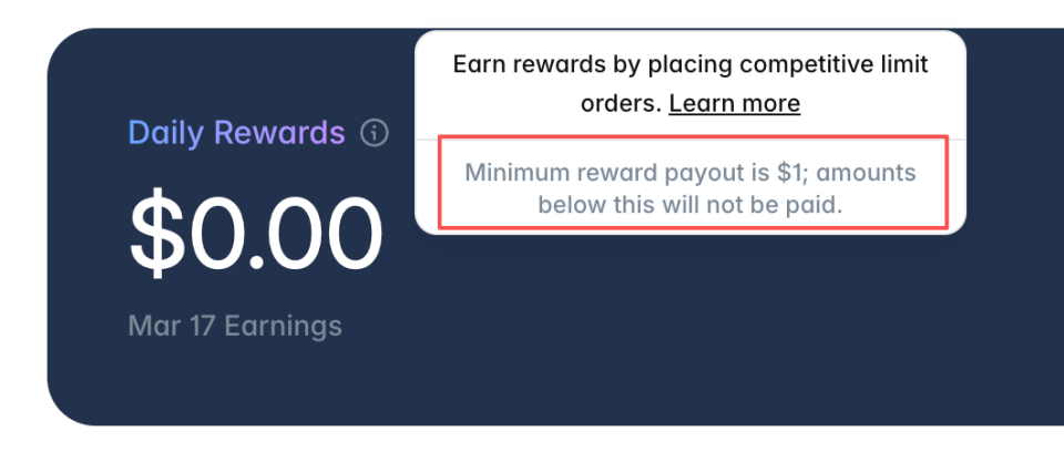 LP 奖励机制 Polymarket 会每天向符合要求的用户分发奖励,奖励金额与你的挂单量、挂单时长、挂单价格等因素相关,但分发的最小金额是1U,如果你每天获得的奖励不到1U,那做的都是无用功。