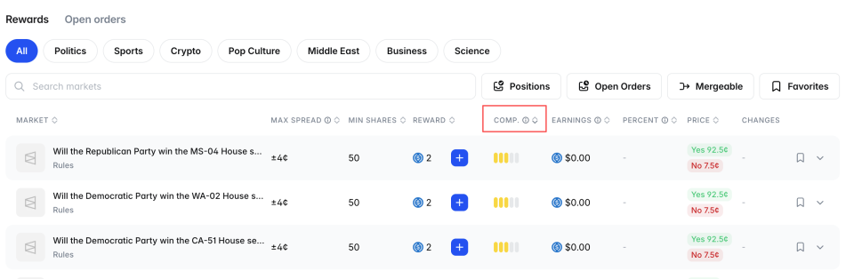 找到竞争度适中的区域,然后看奖励金额,这是该市场每日分发的奖励总额。一般来说,奖励池 $20以上的市场才值得参与,太小的市场即使你占了大头,绝对收益也很有限。