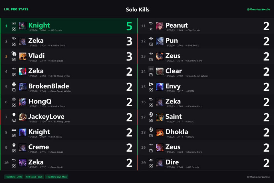 双C数据对比:Knight目前单杀次数5次排在第一位,目前英雄池方面也是拿出了多种属性英雄,不管是传统法师还是加里奥这种进场团控以及刺客型的阿卡丽,都拿到过胜利!Chovy这边经济差排在第一位,面对HongQ这种级别的中单,还能保证对线压刀团战输出爆炸,一个人扛着队伍走!
