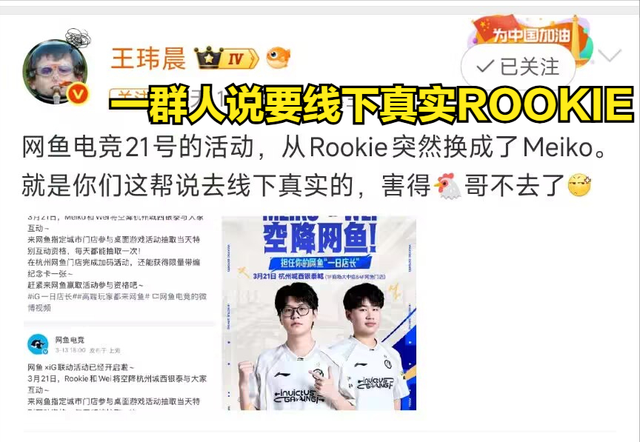 随着ROOKIE外界风评越来越糟糕,很多小钰粉丝都在商量如何为小钰出气。而近期IG某个商业活动,就引起很多小钰粉丝们的关注,毕竟ROOKIE作为活动嘉宾肯定会来到现场,所以很多小钰粉丝都前往这个活动界面下路摇人。这些小钰粉丝表示,要当面大骂ROOKIE是渣男,甚至不少观众扬言要给ROOKIE一点颜色看看,正因为大量观众的反应激烈,主办方为了保护ROOKIE,只能被迫移除ROOKIE,让辅助meiko代替ROOKIE参加活动。