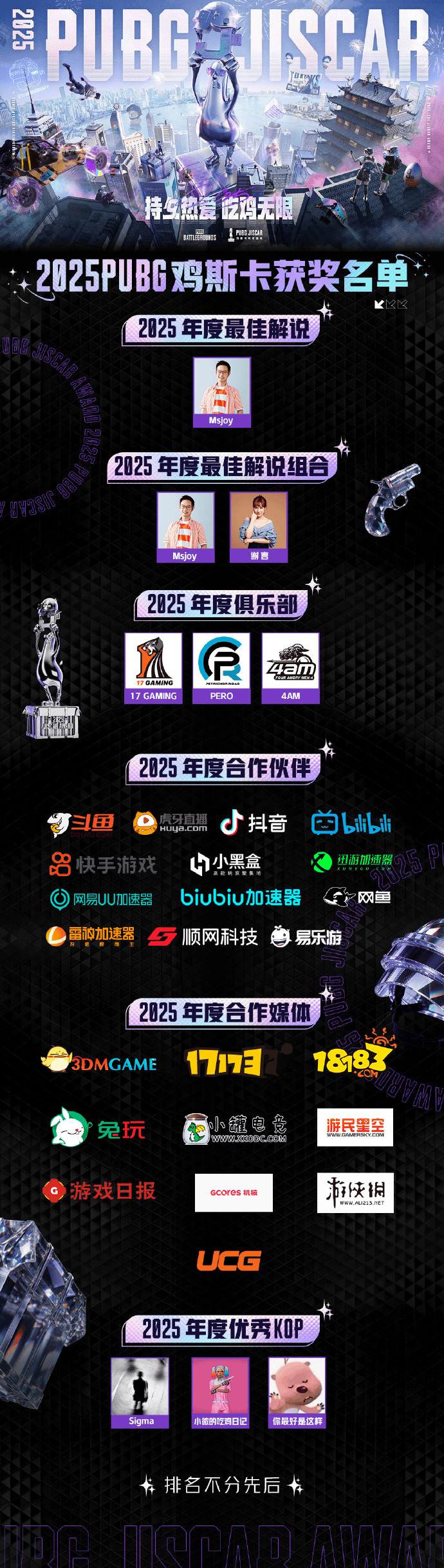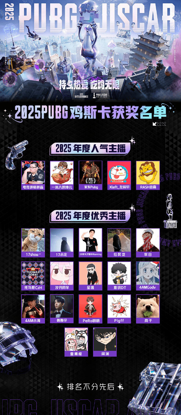 恭喜所有获奖作者、主播及合作伙伴!是你们以创意为光,点亮PUBG生态,让每一份创作都成为高光时刻!