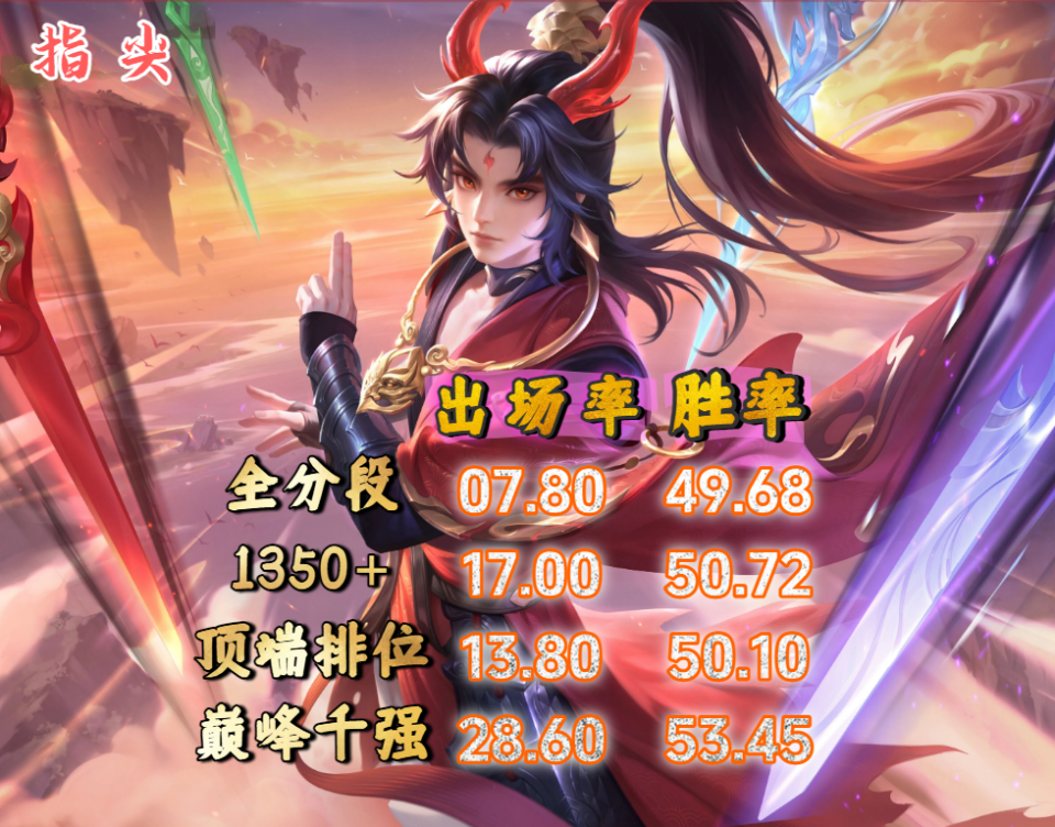 蚩奼在体验服20日削弱,如果实装,或许就要掉下这个位置了,但敖隐和元射真的是相当稳定,优先级相当拔尖,几乎是版本必选的英雄。
