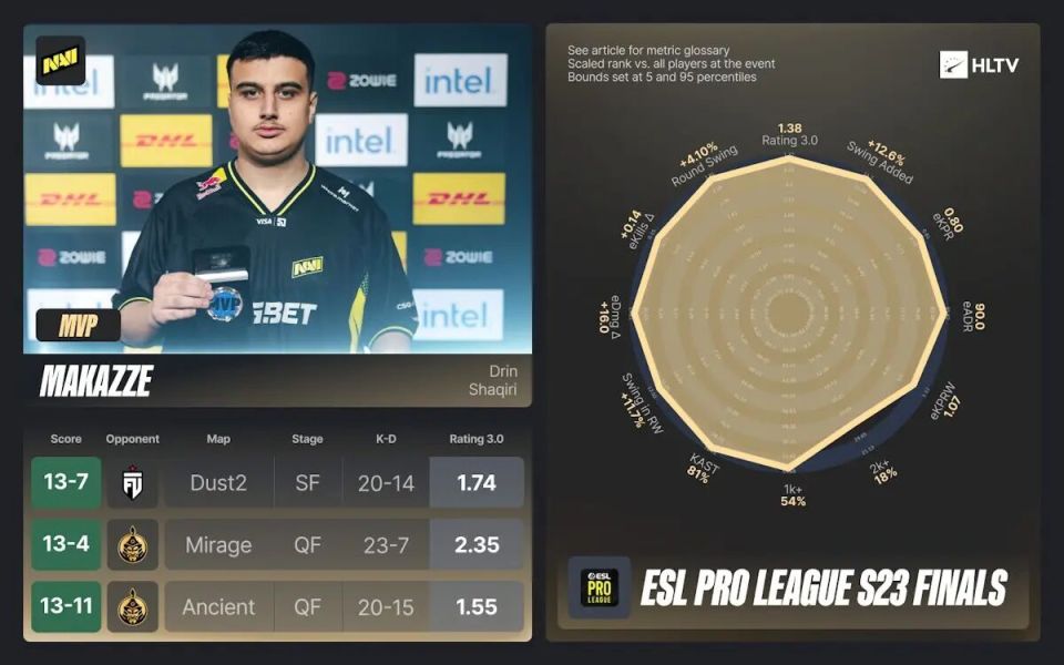 由于Vitality缺席,EPL S23成为了各路挑战者争夺冠军宝座的绝佳机会。最终,五号种子NAVI凭借makazze的卓越发挥摘得桂冠。