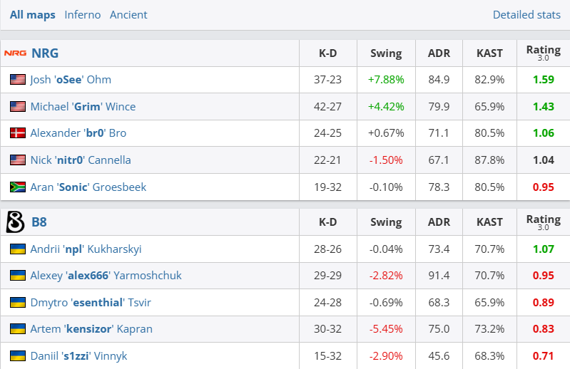 图一Inferno,NRG在进攻方杀穿对手防线,换边轻松先下一城。来到图二Ancient,NRG在oSee和Grim联手爆发下打出10-2铁血防守,换边尽管B8顽强追至9-12,但终局oSee完成2V5终结比赛。