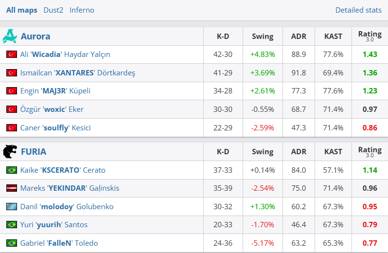 Rating 3.0:HLTV的综合评分,基于击杀、伤害、生存、KAST、多杀和Swing等要素。