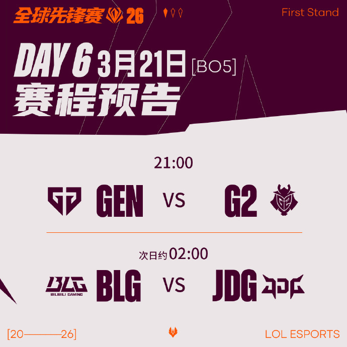 雷速体育3月21日讯 2026全球先锋赛半决赛将于今晚21:00正式打响,首战由LCK强队GEN对阵欧洲劲旅G2,BLG和JDG将在约02:00迎来内战。