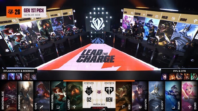 本局G2下路对线状态非常好,配合打野支援两度拿下人头。此后Canyon站了出来抓人成功,但G2利用先锋在其他路换到经济。进入中期后,Kiin的薇恩没有任何作用,连续几波被抓死,在打出一波0换4后,G2拿下大龙,虽然第一波推进被守住,但G2利用最后一点增益时间推掉GEN基地,拿到三个赛点!
