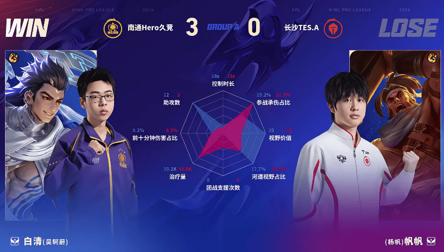虎扑03月22日讯 Hero/TES.A第三局数据对比:Hero上野多数据领先对位