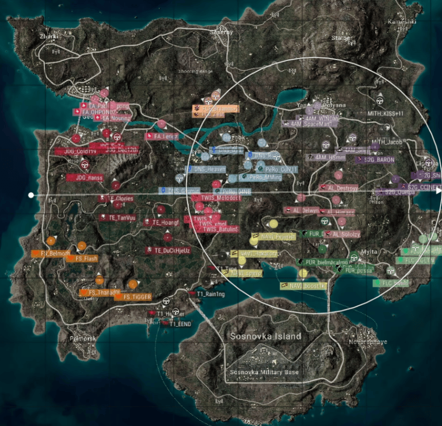 梅花桩,4AM依靠道具优势集中攻击PeRo一侧,PeRo无限被白后只能趴地反击,4AM打掉3人,同时TWIS也被淘汰出局,最终4AM清理PeRo独狼,完成吃鸡。