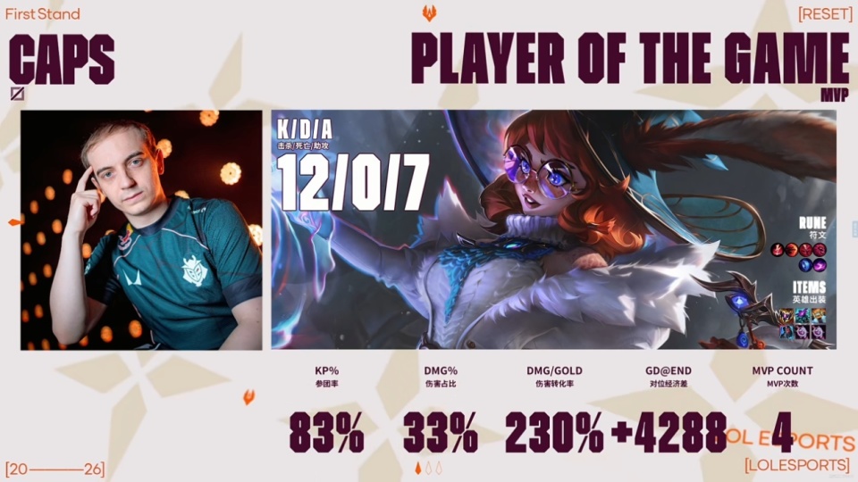 Caps阿萝拉也是再度封神,全场0阵亡打出了12-0的超神战绩。