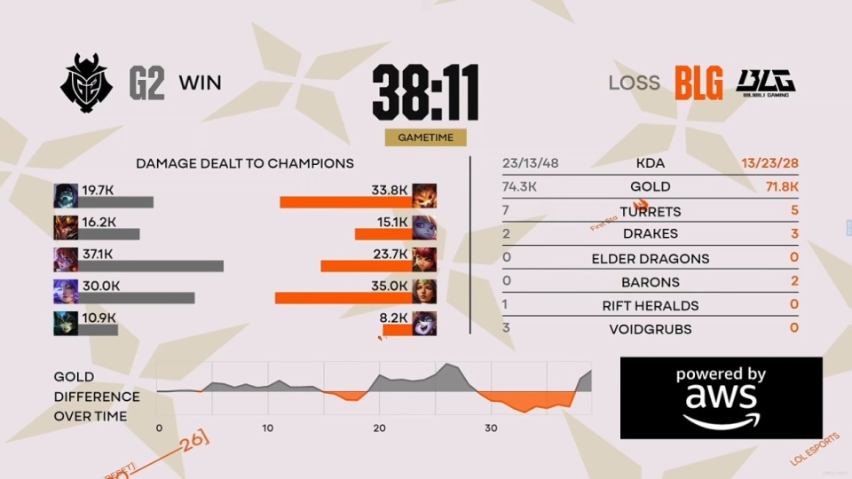 人头互换的情况下,BLG掌控小龙资源,G2拿下三条巢虫,随后的先锋博弈中,BLG出现失误,站位犹豫被G2先手抓机会击杀辅助,随后又击杀Viper。