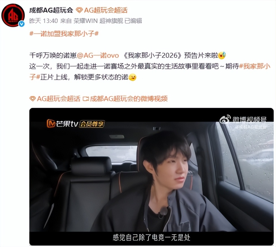 即使现在AG超玩会在胜者组要面对气势如虹的JDG,一诺也没有复出的打算,直播中也说过了,春季赛是不会打了,挑杯再说吧。至于休息的时间一诺干了什么?最近网友们也知道答案了,没错,一诺上了热门综艺,我家那小子。这不,AG也是晒出了预告片,从预告片可以看到,一诺和家人还发生了争吵,最后甚至说自己除了电竞一无是处。你还别说,这个台本确实吸引人,矛盾制造的很好。但是一诺真爱粉不会相信,应该太了解一诺了,这不是一诺会说出来的话,而且,一诺和家里人的关系,十分的好,一诺也很享受妈妈亲自喂食物,橘子是不用自己亲自吃的,一诺爸爸都羡慕。