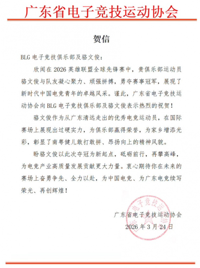 广东电竞协会给On发贺信:彰显了南粤健儿敢打敢拼、昂扬向上的精神风貌