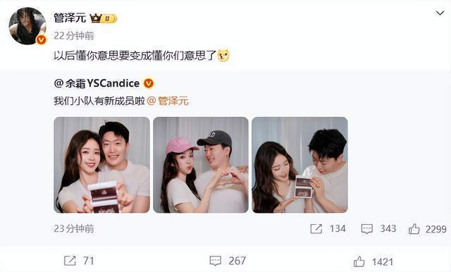 而在先锋赛打完后,结束了解说工作的管泽元也正式在微博上和余霜一同官宣喜讯:“我们小队有新成员啦!”结合在微博中晒出的两人手拿宝宝的彩超照,脸上带有幸福的微笑,管泽元和余霜显然公布的是怀孕的喜讯。而管泽元升级当爸爸的消息,很快就登上了微博的热搜。