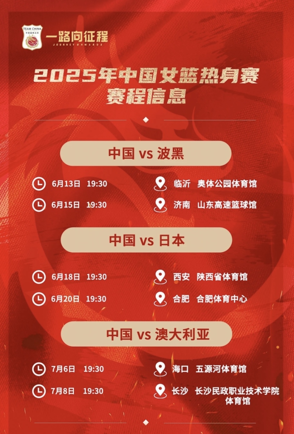 北京时间6月13日,为备战2025国际篮联女篮亚洲杯,中国女篮宣布将于今晚起开启热身赛备战亚洲杯。在接下来的26天的时间里,中国女篮将辗转6座城市,先后迎战波黑、日本和澳大利亚。
