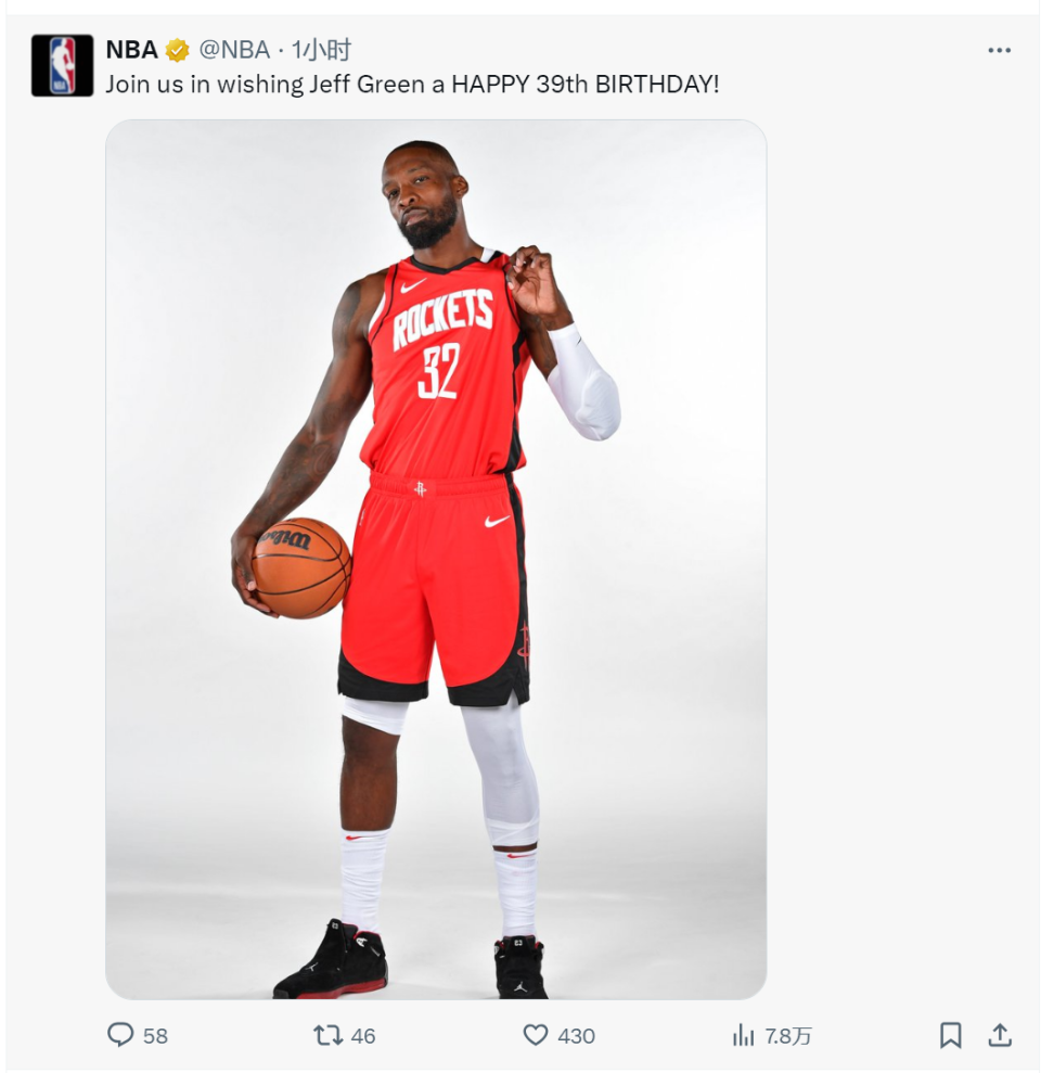 北京时间8月29日,今天是火箭老将杰夫-格林39岁的生日。NBA官方晒图为其庆生:“让我们一起祝杰夫-格林39岁生日快乐!”格林跟杜兰特、康利、霍福德等人都是2007届新秀,在联盟已经征战18个赛季,NBA生涯也接近尾声了。