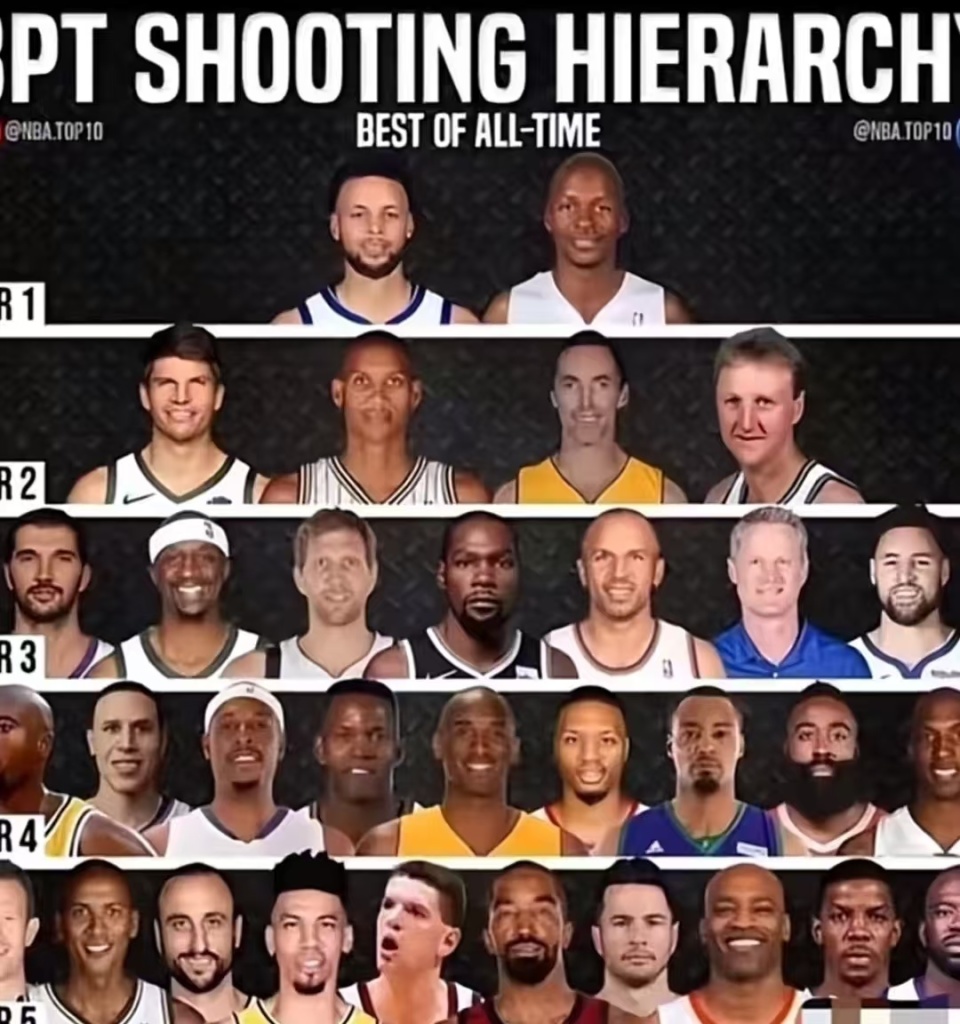 在NBA里尤其是小球时代到来之后,投射能力成为了外线球员的必备武器,很多后场球员即便天赋出色,他们没有稳定的投射也会被联盟淘汰,像16年的状元西蒙斯、17年状元富尔茨,到现在在自由市场上都没人认领,所以说投射是现役后场在联盟立足的关键。说到这了,此前美媒给历史射手进行了分档,一起来看看合理吗?