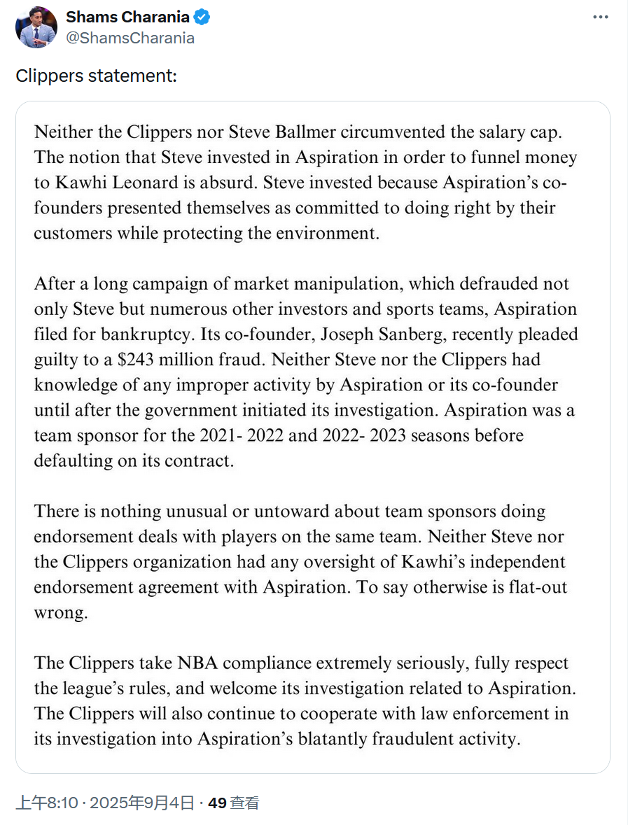 经过长期市场操纵活动,Aspiration 公司不仅欺骗了鲍尔默,还欺骗了众多其他投资者和体育球队,随后申请了破产。该公司的联合创始人约瑟夫-桑伯格最近对一项涉及2.43亿美元的欺诈罪表示认罪。在政府启动调查之前,鲍尔默和快船队均不知道 Aspiration 及其联合创始人有任何不当行为。Aspiration在2021-2022以及2022-2023赛季是球队赞助商,之后违反了合同约定。